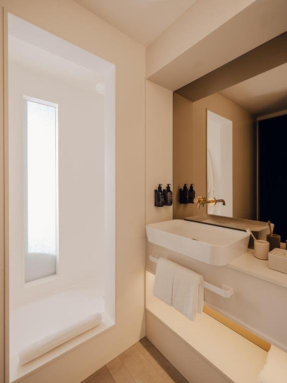 The bathroom continues that minimal Japanese-luxury theme. Gold taps. Clean stone finishes. Bright but warm lighting. Fully stocked with shower gel, conditioner, hand wash, toothpaste, toothpicks, facial amenities, and thick white towels that actually feel hotel-grade. In some rooms, the freestanding bathtub becomes a feature moment  soaking there at night feels indulgent without being dramatic.